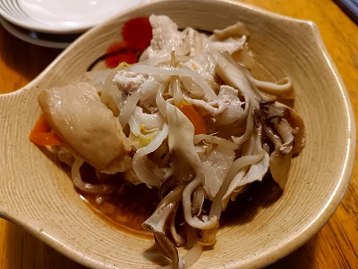 今夕飯は、家内のリクエストでありきたりのポンゴマ肉、キノコ、野菜蒸し