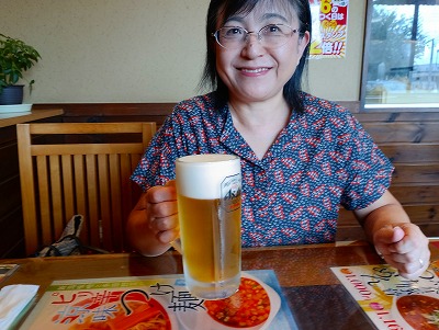 休日昼麺類、「無尽蔵」さんでは、豚骨醬油チャーシュー麺大盛りなのですが、チャーシューが1枚なのが4枚になるだけで300円値段が上がるのが不満なので、トッピングで刻みネギをチョイス。こっちがいいね!。。家内は絶対というほど塩なのに味噌。。。変わらないのは餃子と、、、家内生ビール2杯!