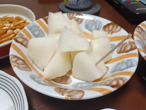 。。。寝酒は頂き物の梨を。ケア、果物の中で一番好きかも!?