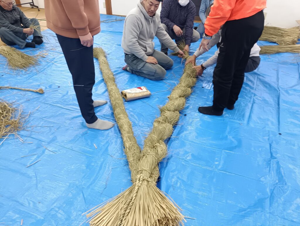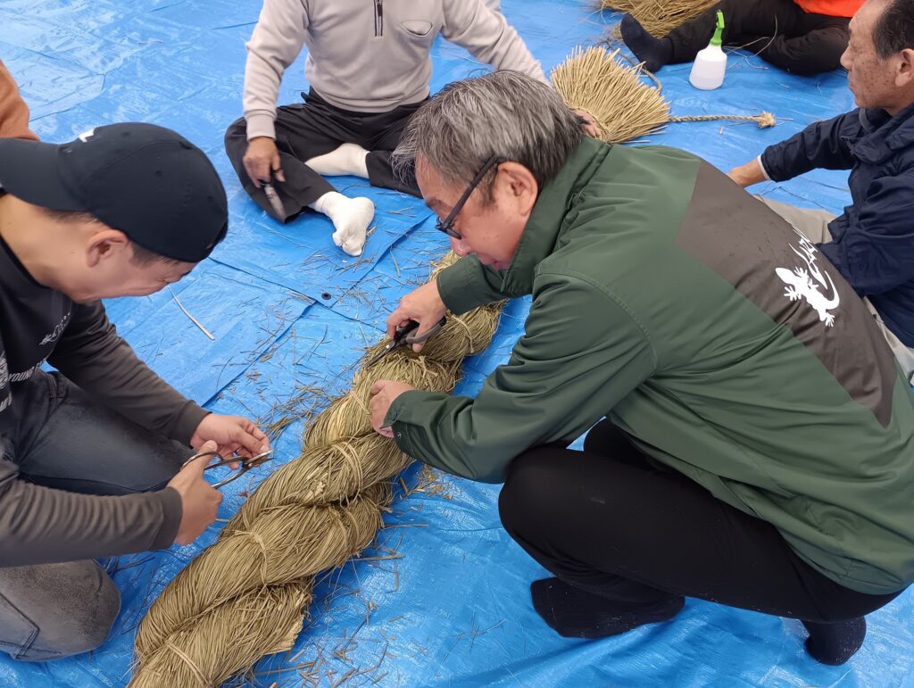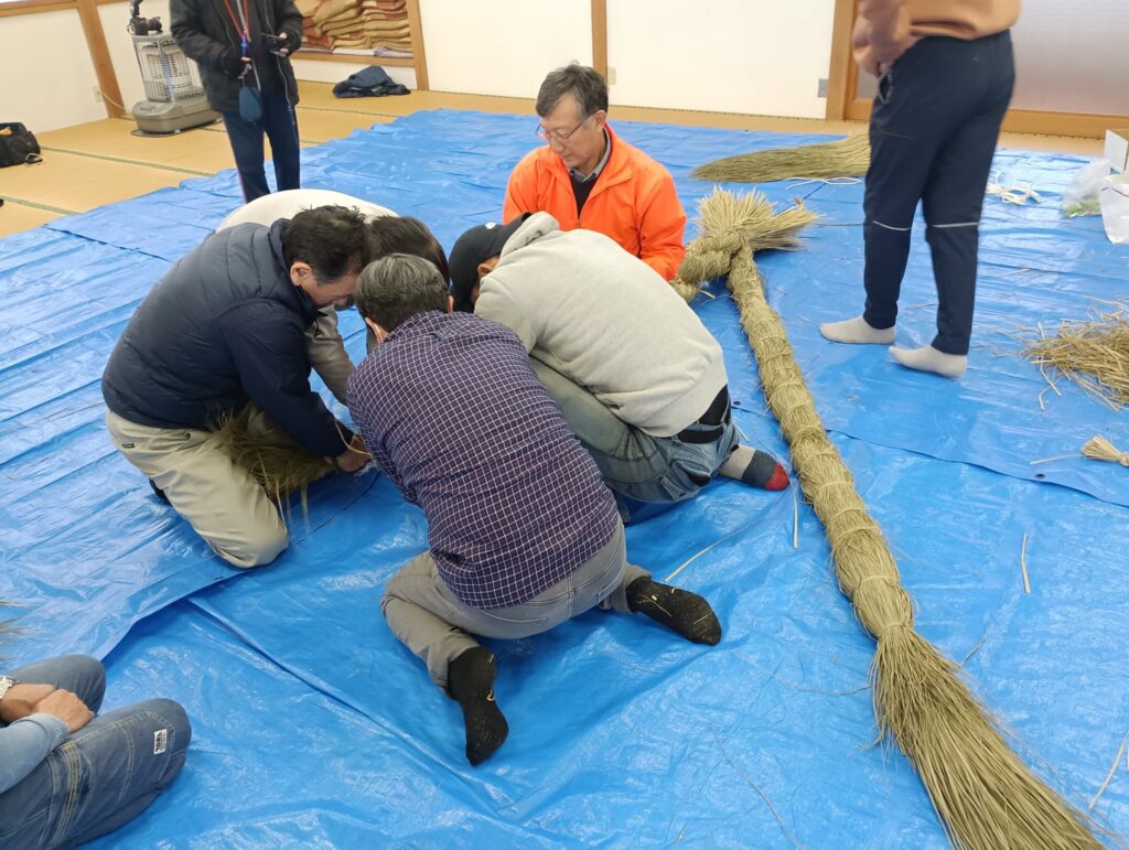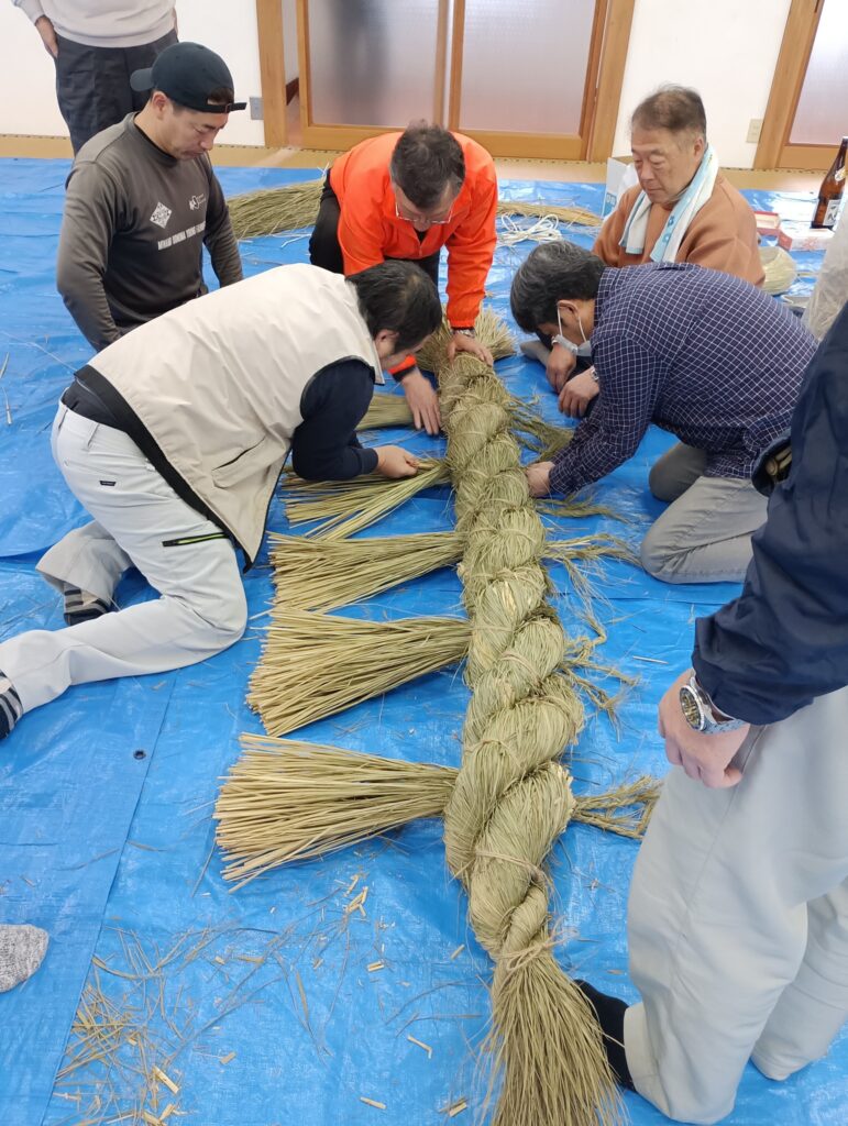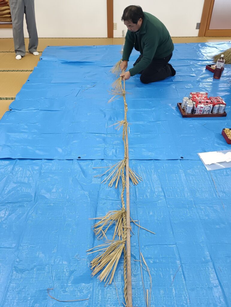 昨日は「集会所の掃除としめ縄綯い」をおこないました!。。。ボクんちの地域では一村一神社であり、鎮守様に飾る大しめ縄、棒締め縄を区長、氏子ら役員で作ります。。。といっても先輩がいないとできませんが。。。ボクは手首の問題で役に立たず、フリをしている画像。。。南魚沼町内でこのような大しめ縄を作っている所はあるのでしょうか?。。。慰労会を盛大にやって、吞み足りず、もつ鍋を作ってくれた巻のダイヤモンド警備保障社で二次会。。。酔った~!