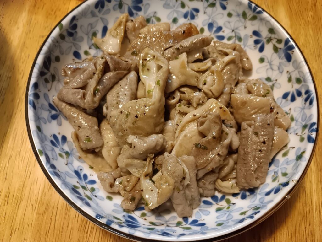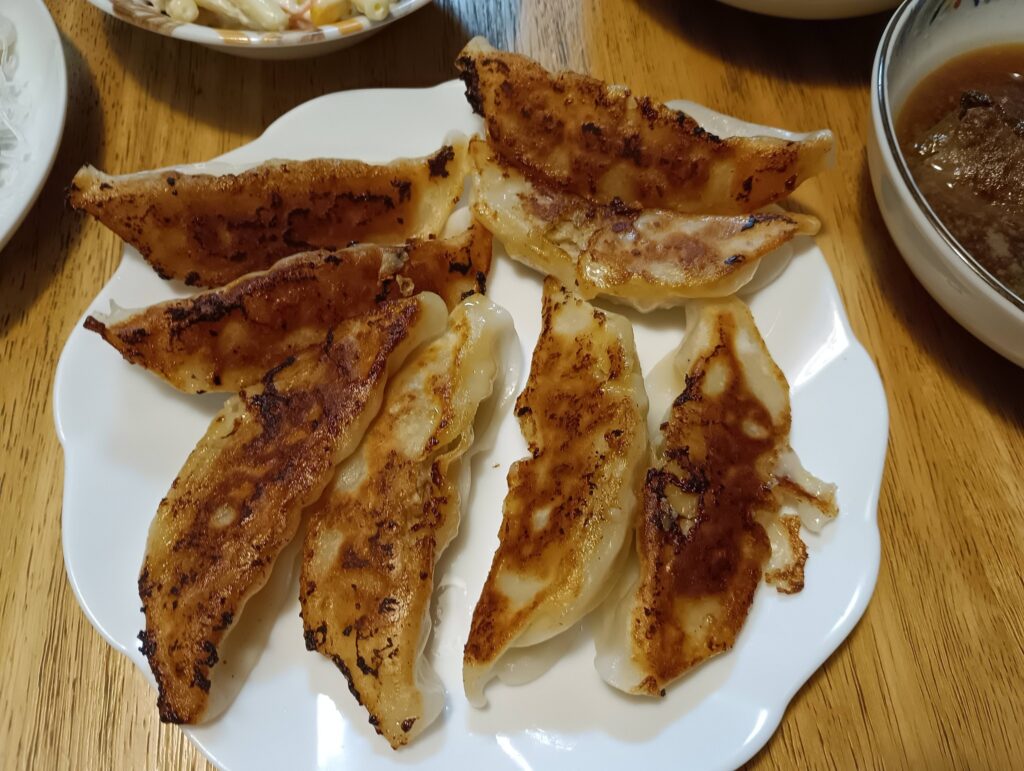 一昨日の新年会のお土産で頂いた「やまちく」さんセットの一部、餃子と塩ダレモツで夕飯を!。。。フライパンがナイスジョブ