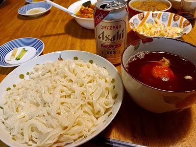昨晩の8時から何も食べていなかったので、さすがにお腹が空きました。。。消化の良いものでうどんの大盛り。。。ノンアルビール。不味かった。。。ケアもボクのテンションの低さに気付いていた