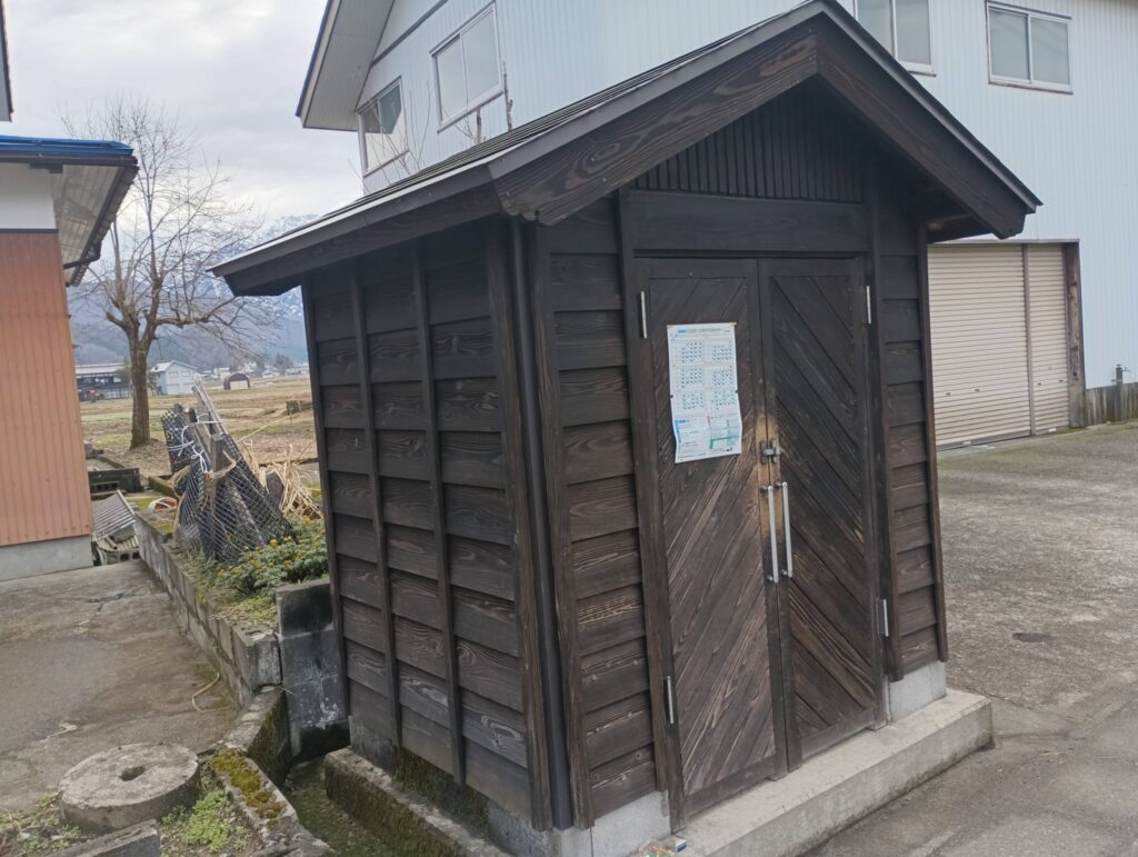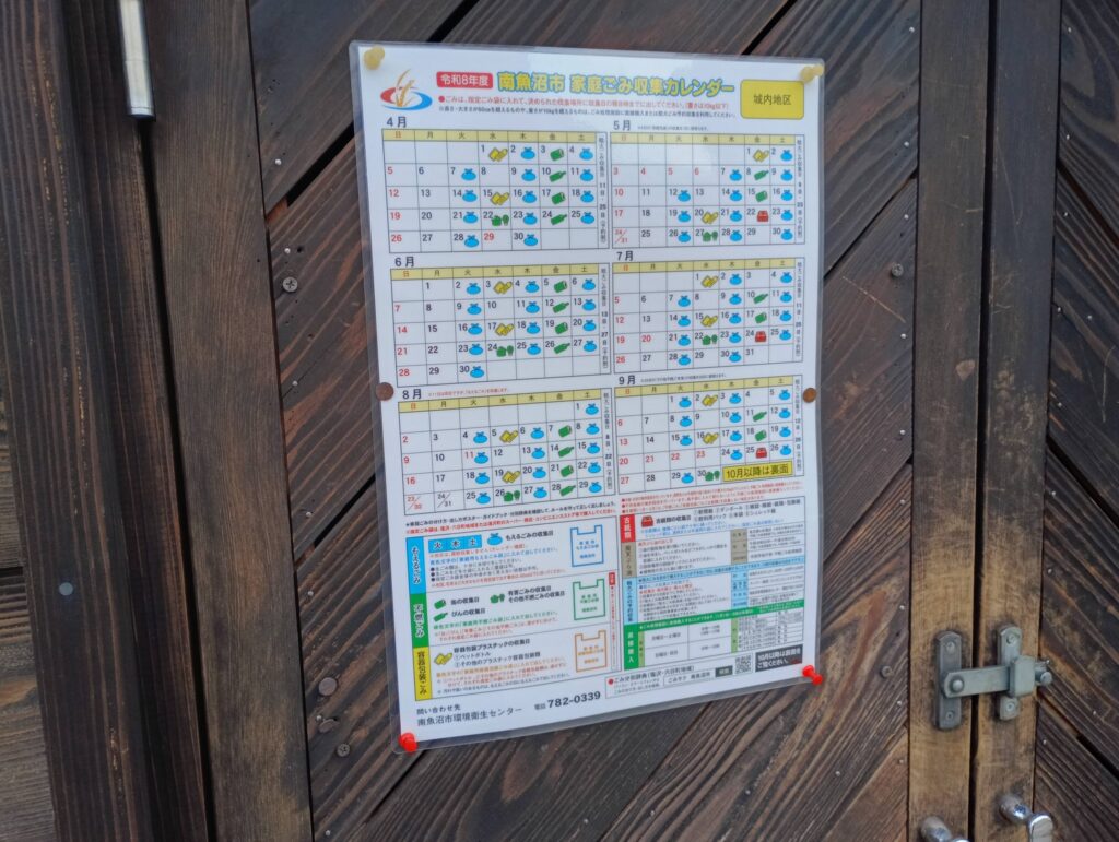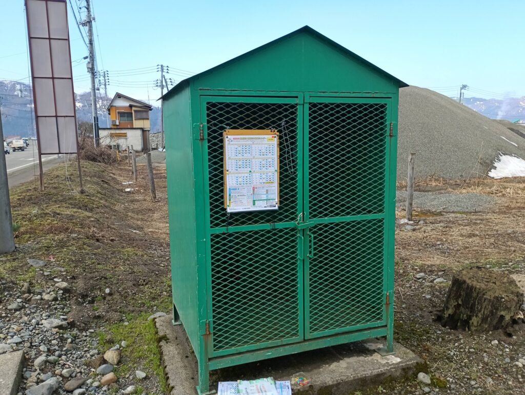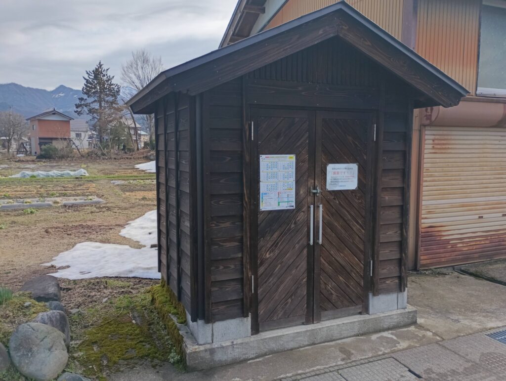 今朝はゴミステーションのカレンダーを先輩から雨雪に負けないラミネート加工をして頂き、4箇所の貼り替えでした。メイン通りは、村の景観に合わせて木製のシャレたステーション。。。何年か経つと防腐剤を塗ります