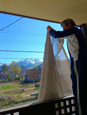 こんな遅い時期に防雪ネットを外しました。。。ベランダから八海山が綺麗に見えました!